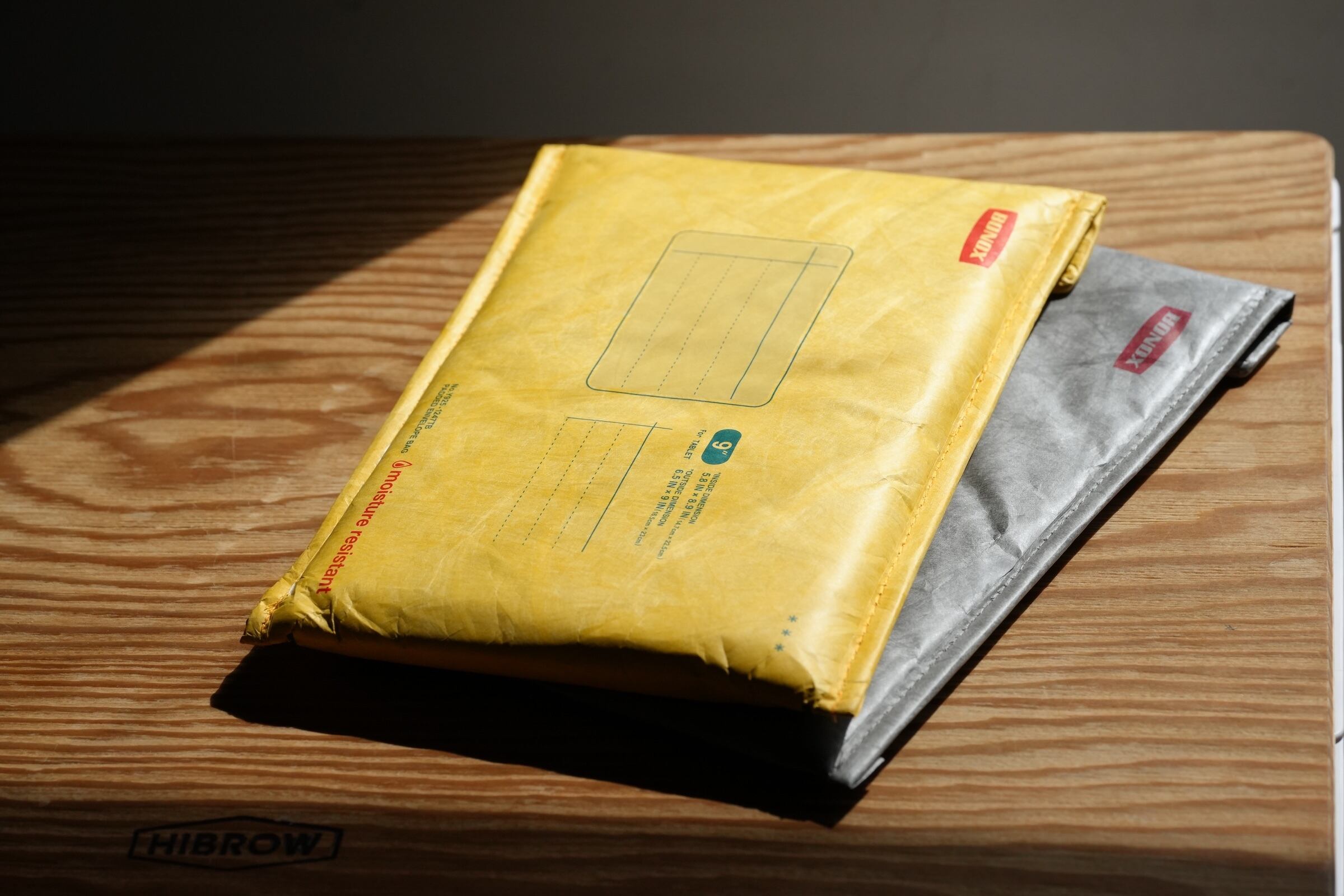 海外の郵便物でよく見かける、クッション性のある封筒の雰囲気をそのまま残したタブレット・ラップトップバッグ。