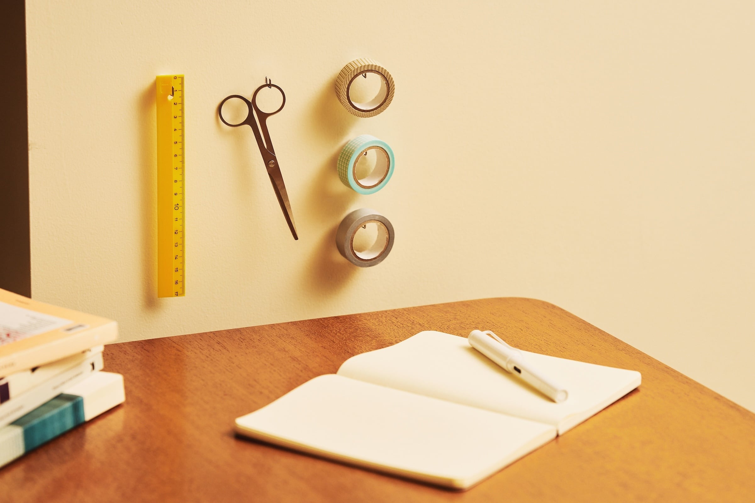 壁に刺しても主張しすぎない幅0.8mmのピン。一本の線を曲げるという発想から生まれたフォルムは、壁に「掛ける」という機能をもたらします。アクセサリー、カレンダー、鍵、ベルト、コードなどお好みのアイテムをリビングや玄関で。