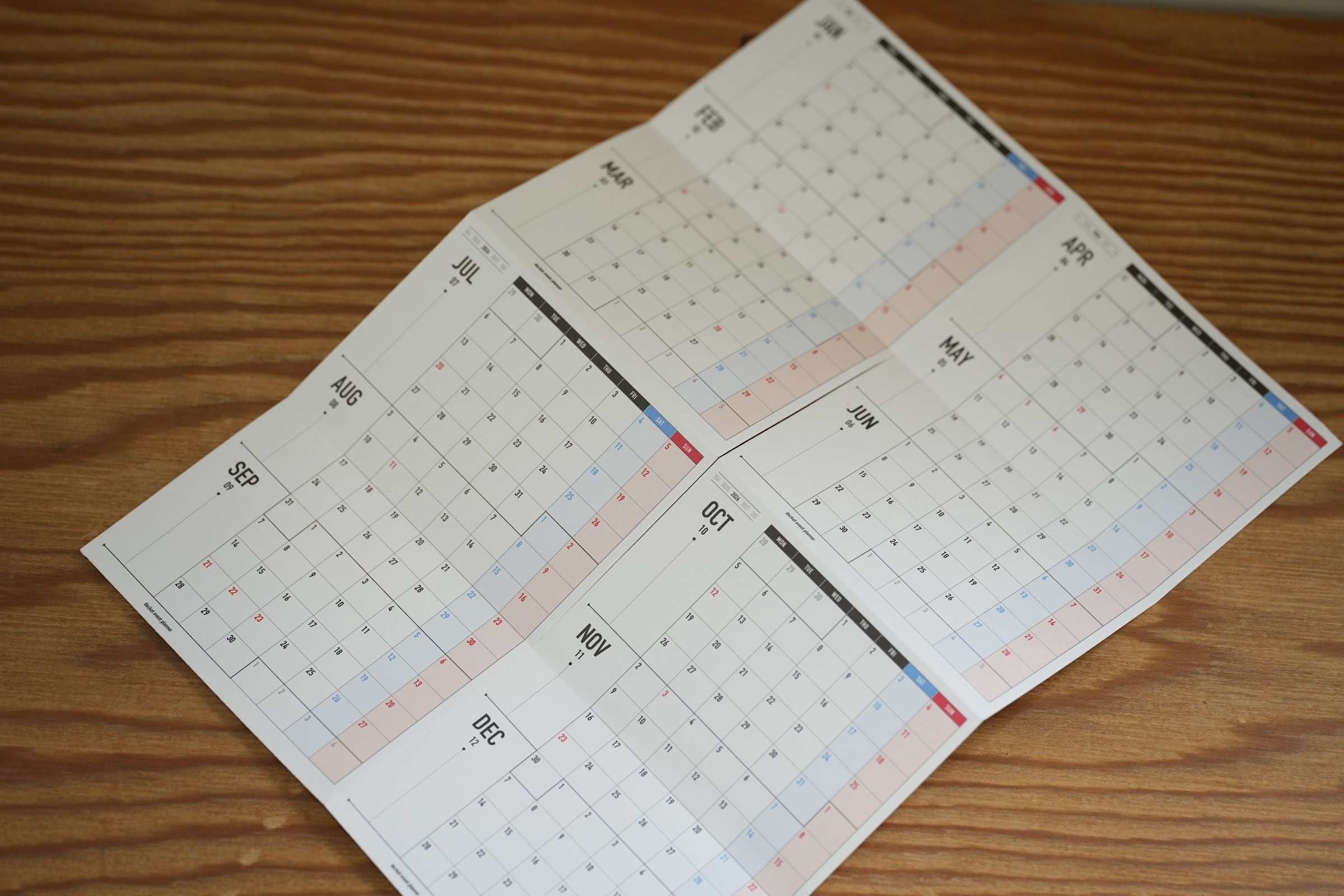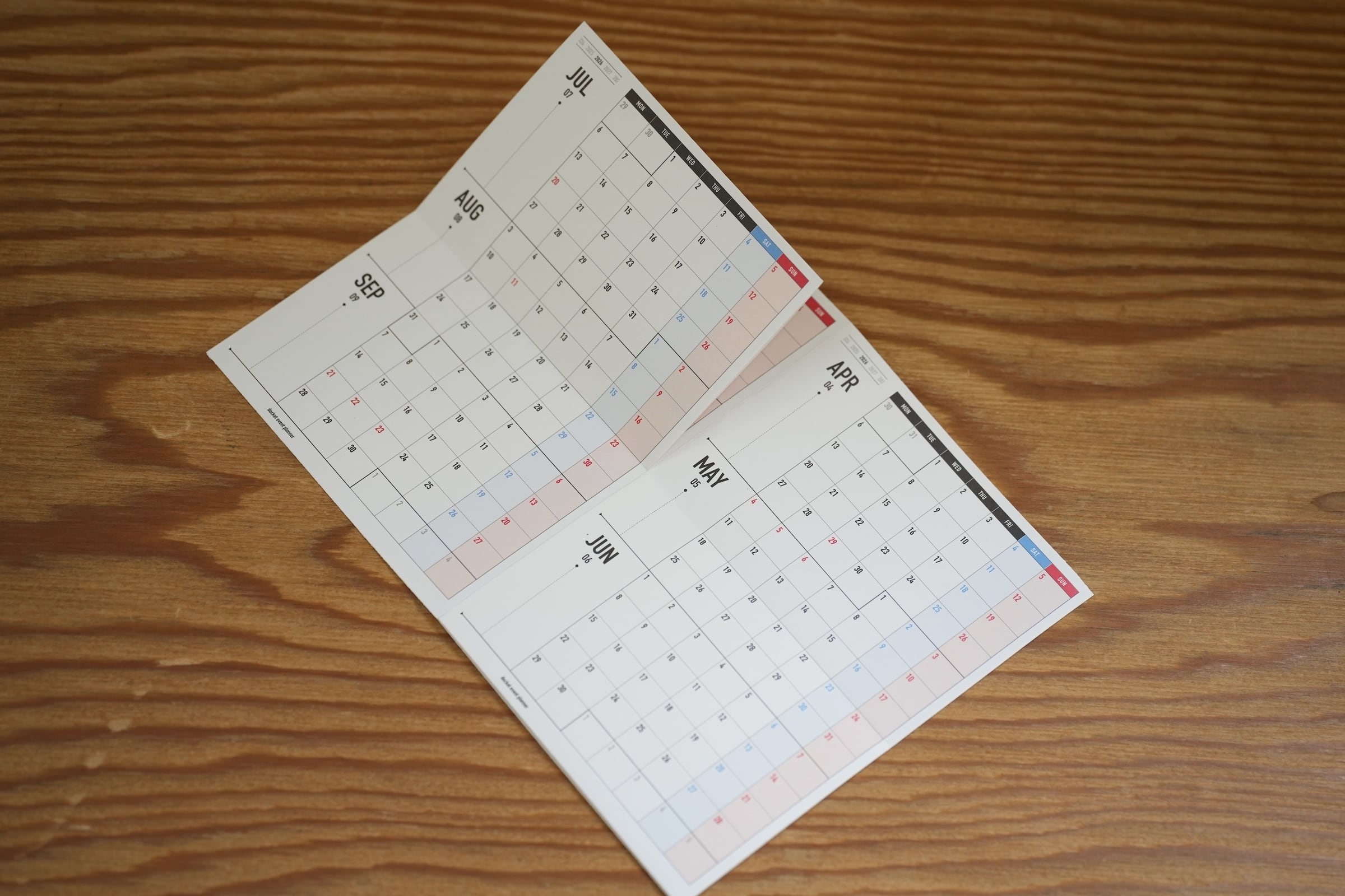 更に紙を広げた状態だと1年間(12ヶ月)のスケジュールがLARGEだとA3サイズ、SMALLだとA4サイズで一覧できます。