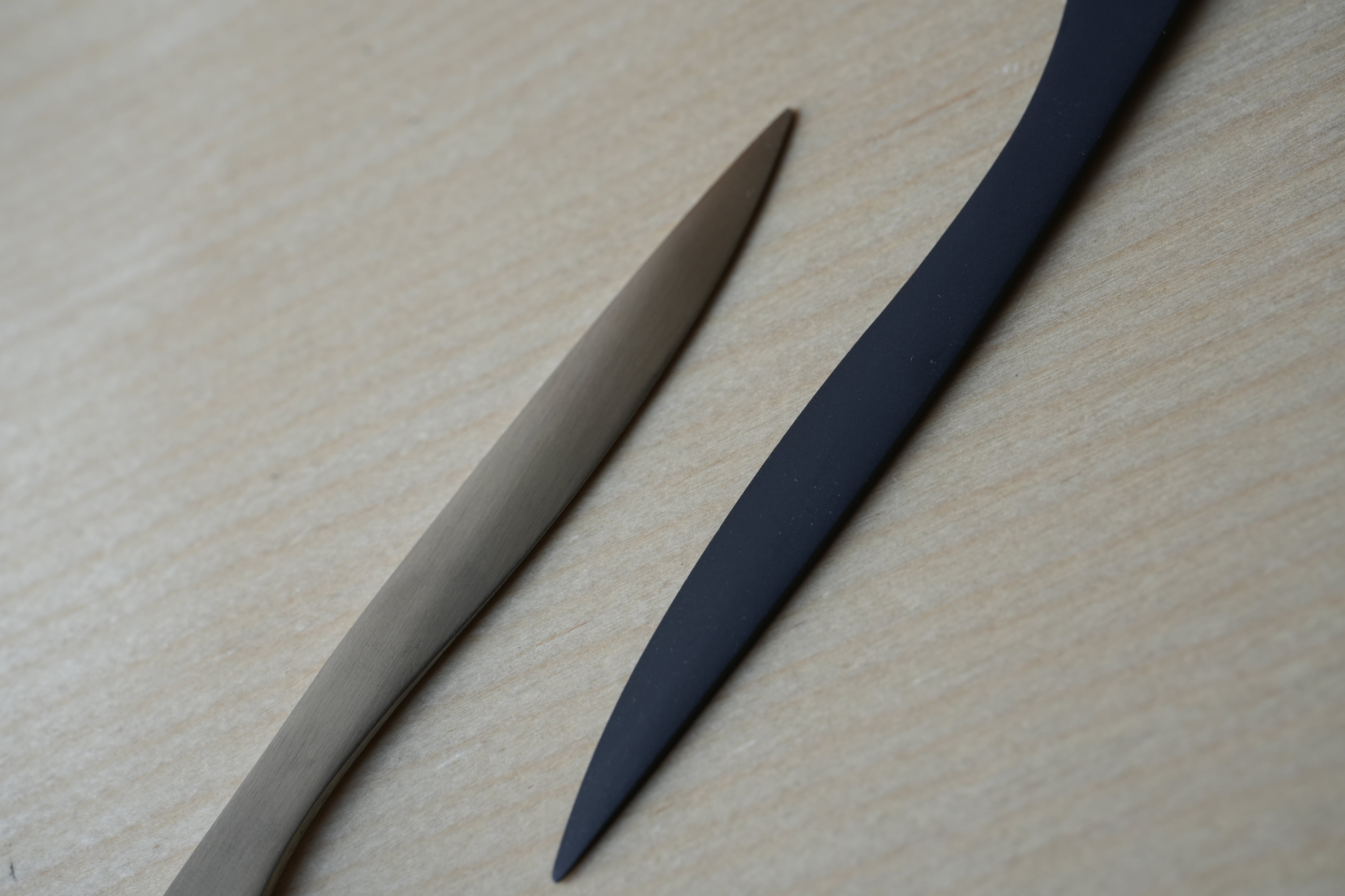林刃物さんの事務用はさみと並べて使いたくなるペーパーナイフ フッ素コートをまとって、「非粘着性」を機能として取り入れつつ、黒いカラーになったモデルです。 封筒の開封に役立ってくれます。 本体サイズ:170✕30x7mm 刃渡り:60mm 板厚:2.3mm 材質:本体/ステンレス刃物鋼、リング/エラストマー樹脂 日本製