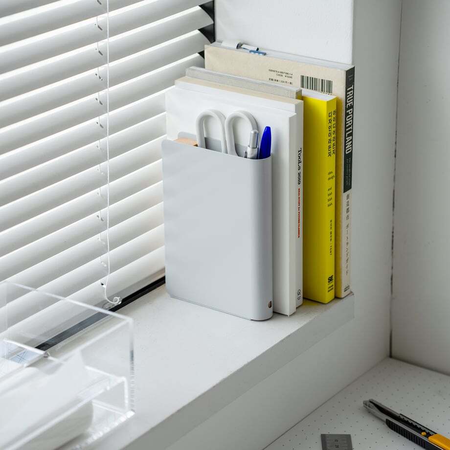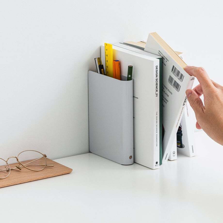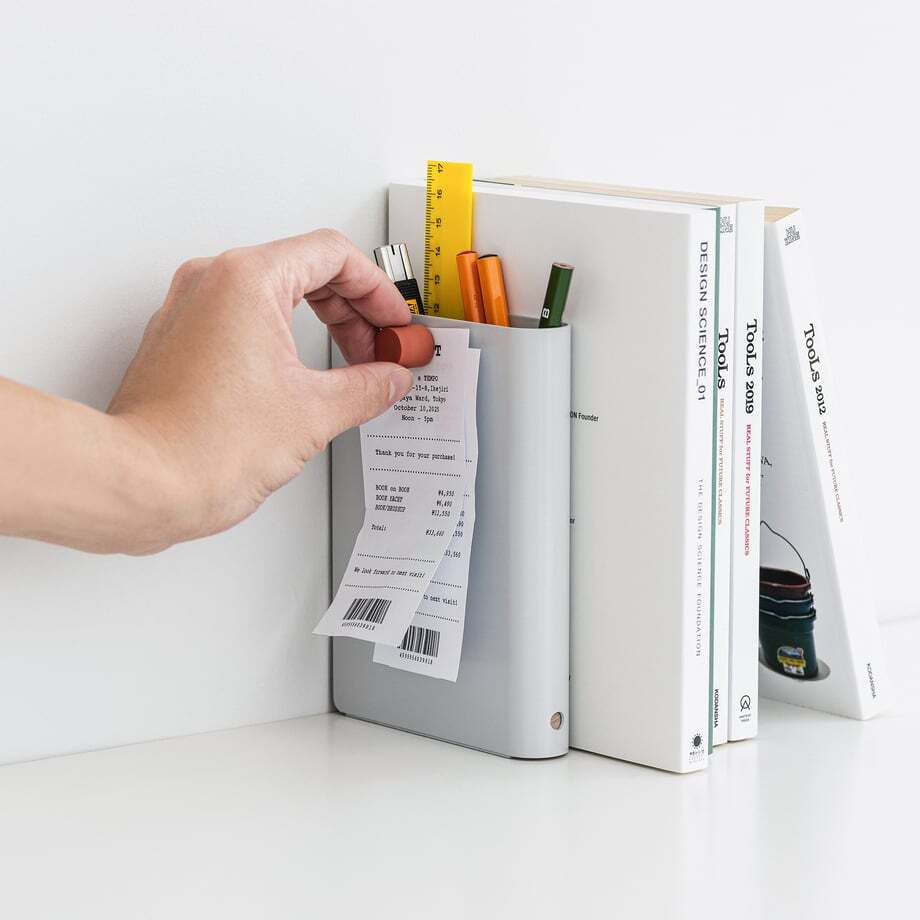TOOLBOOKは、読みかけの本やよく使う文房具など、つい出しっぱなしになってしまう小物をまとめて収納できる、本のようなブックエンドです。