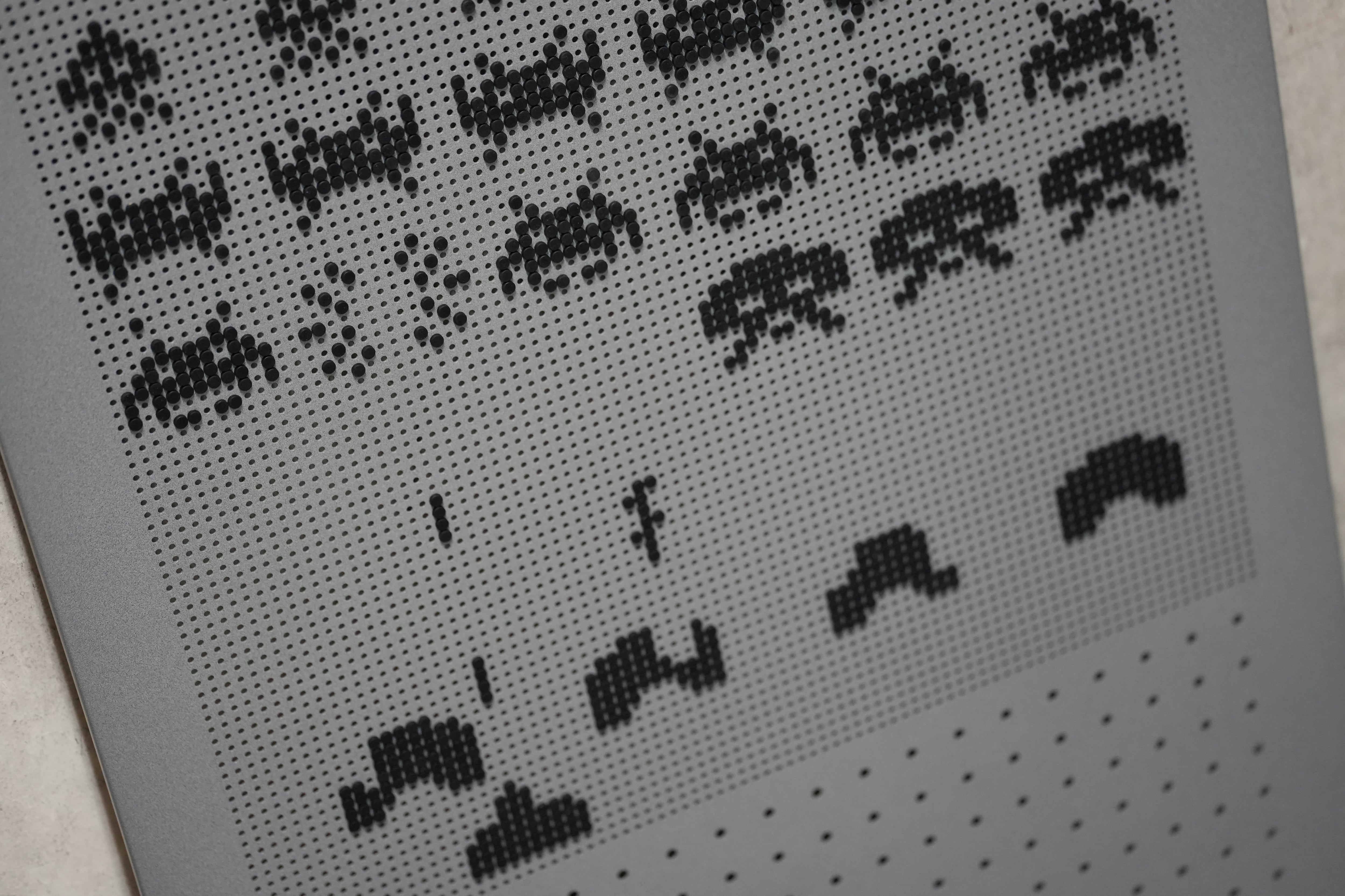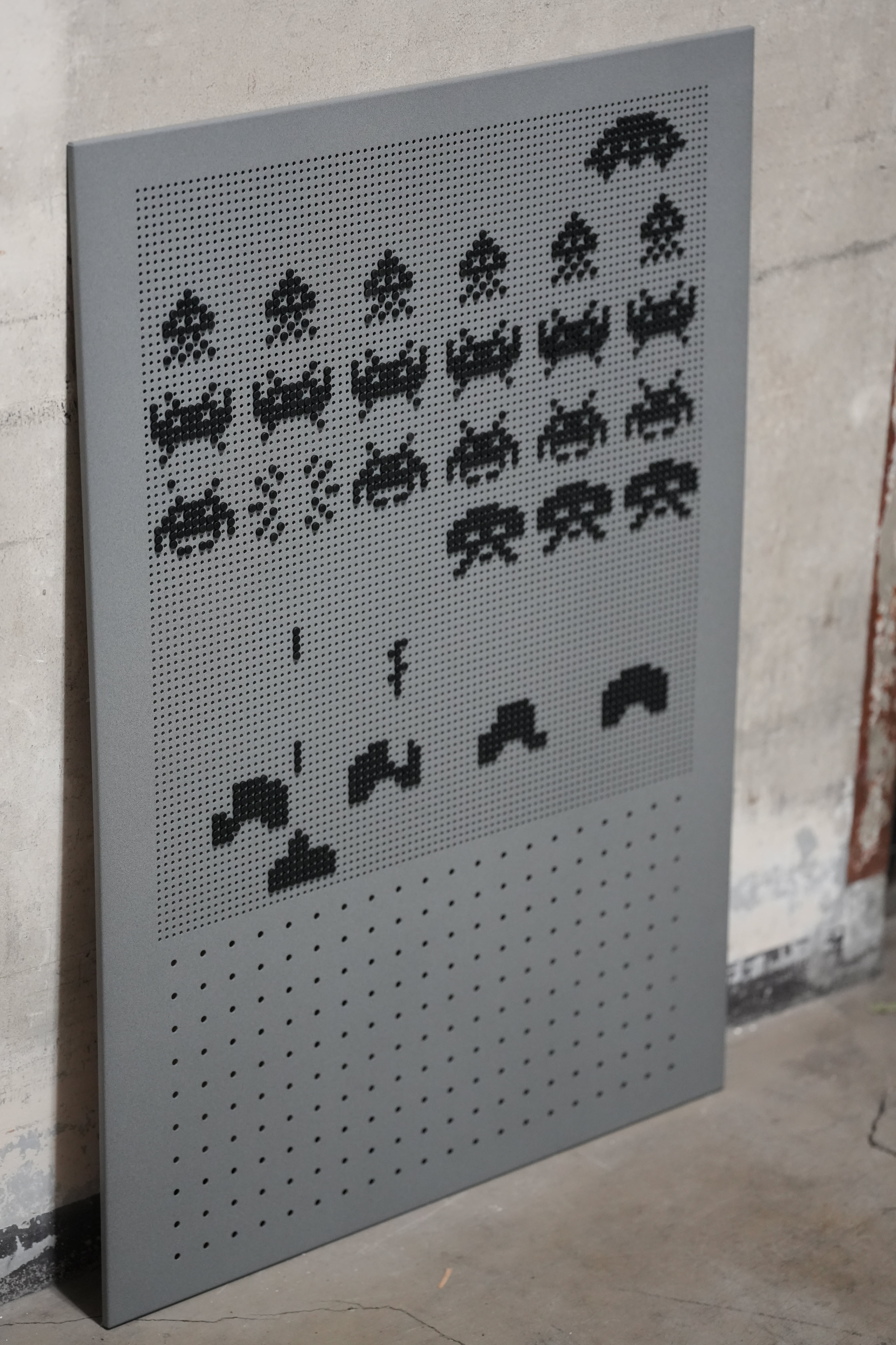1粒ずつゴム製のドットを抜き差しすることで、自由に表示を変えることのできるドットマトリクスな看板です。