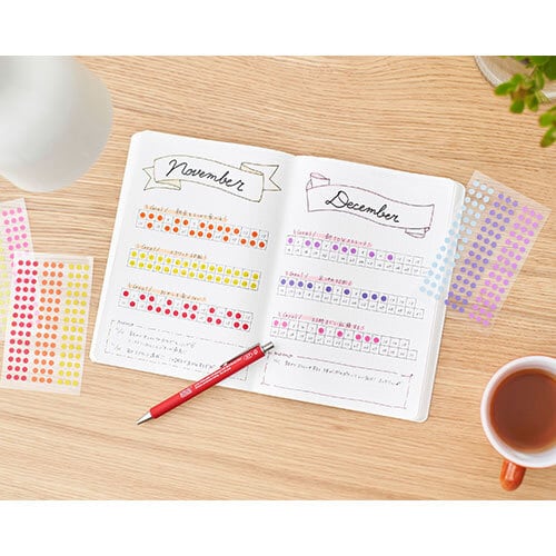重ねて貼ることで、多彩な色の変化が楽しめるため、分類、識別だけでなく、メモ留めや装飾、描画用(丸シールアート)にもお使いいただけます。