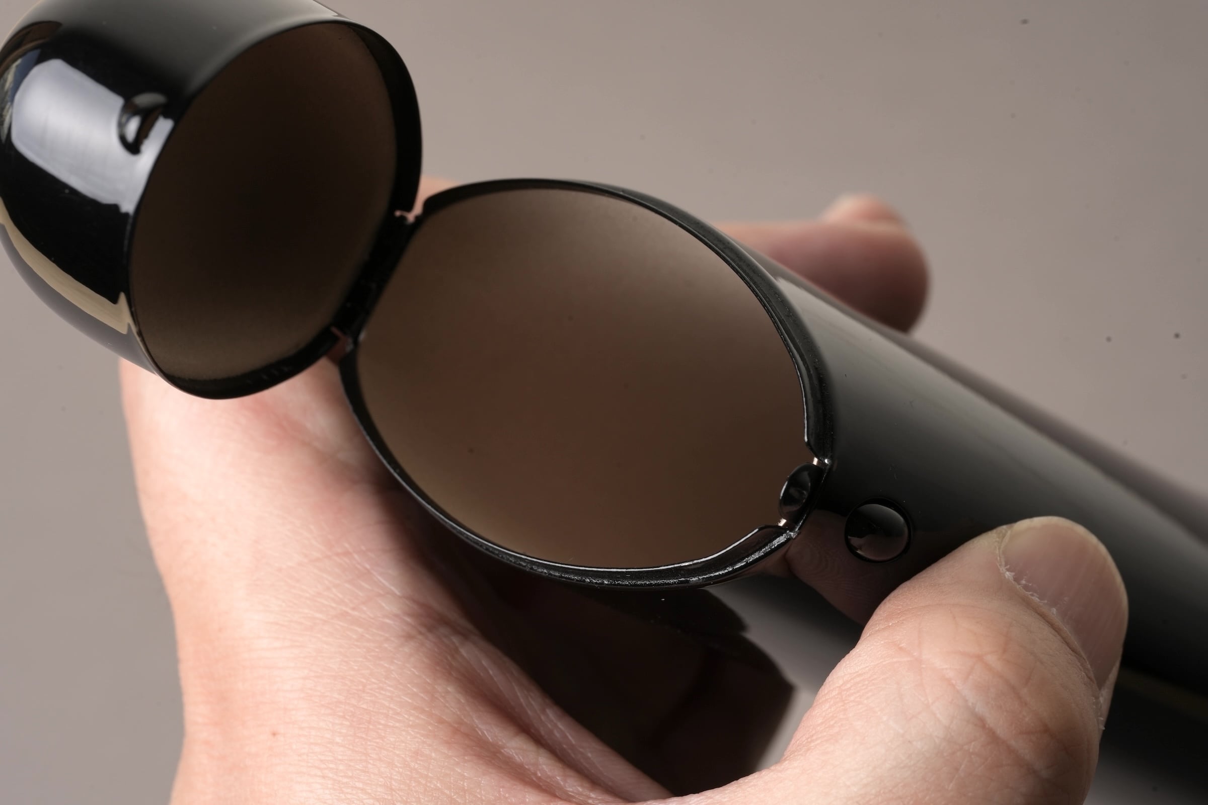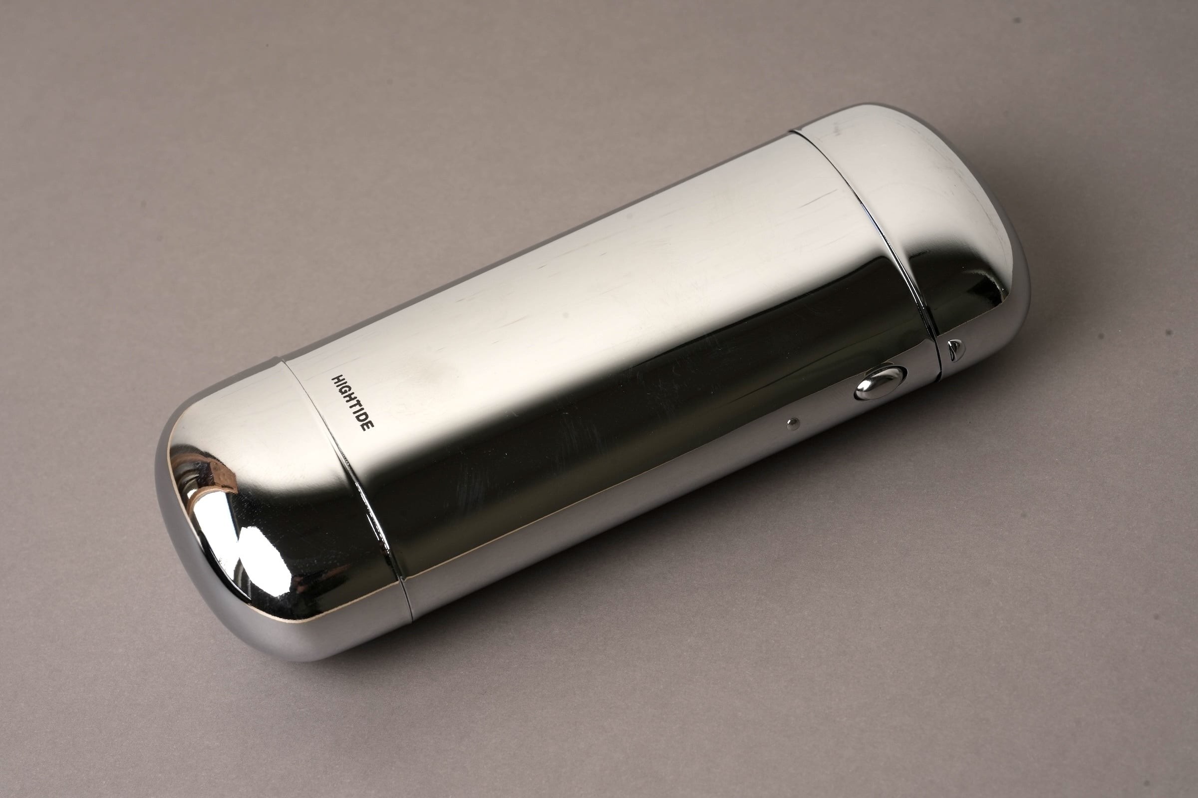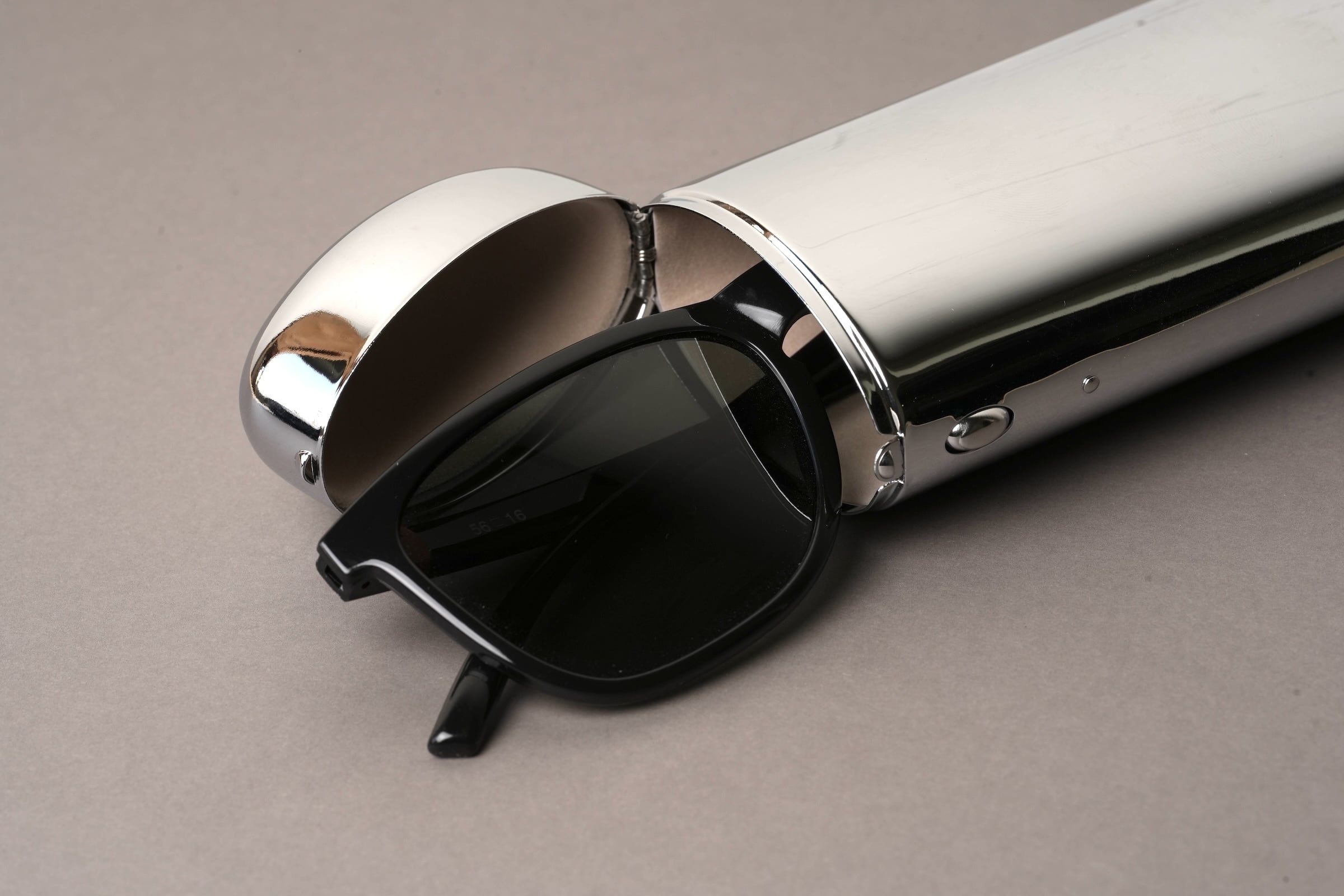 ボタンひとつで蓋が「カパッ」と開くスチール製のメガネケース。
