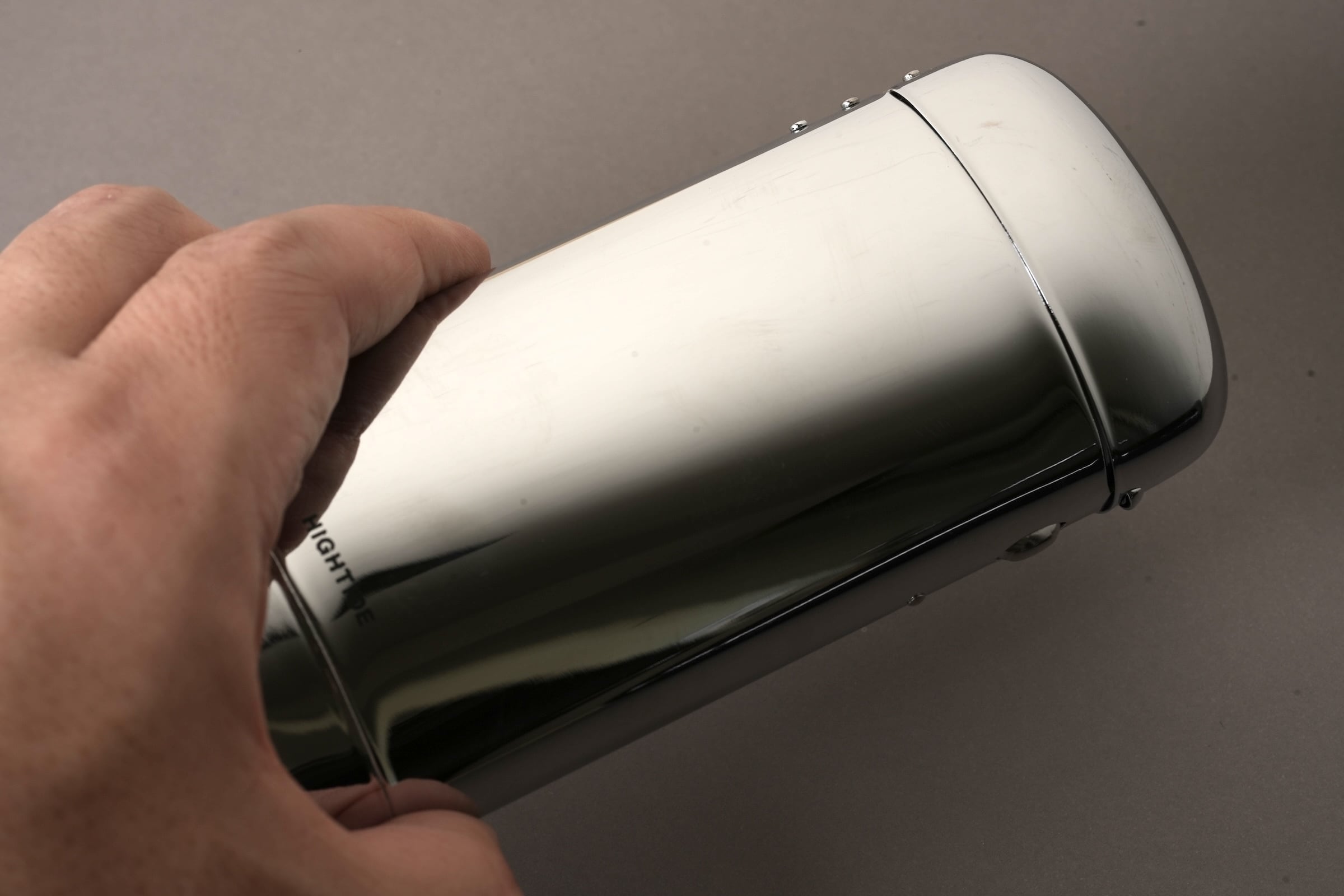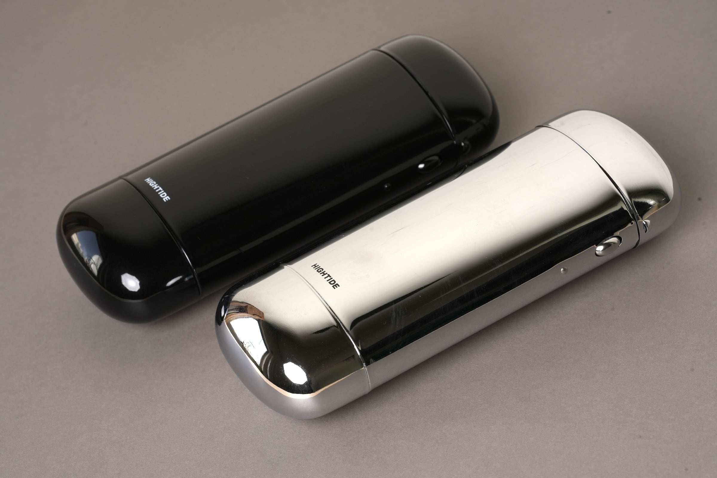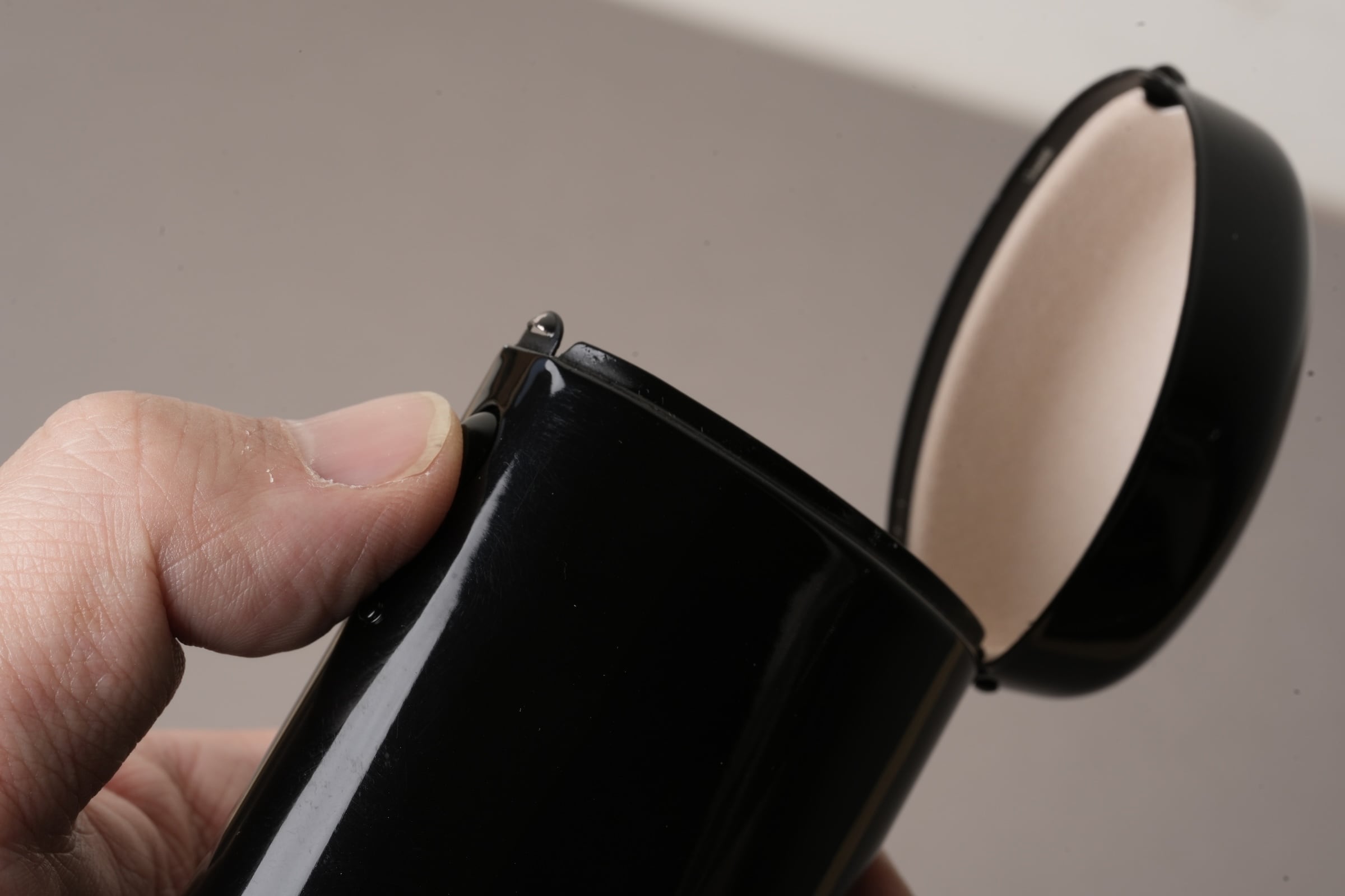 ボタンひとつで蓋が「カパッ」と開くスチール製のメガネケース。