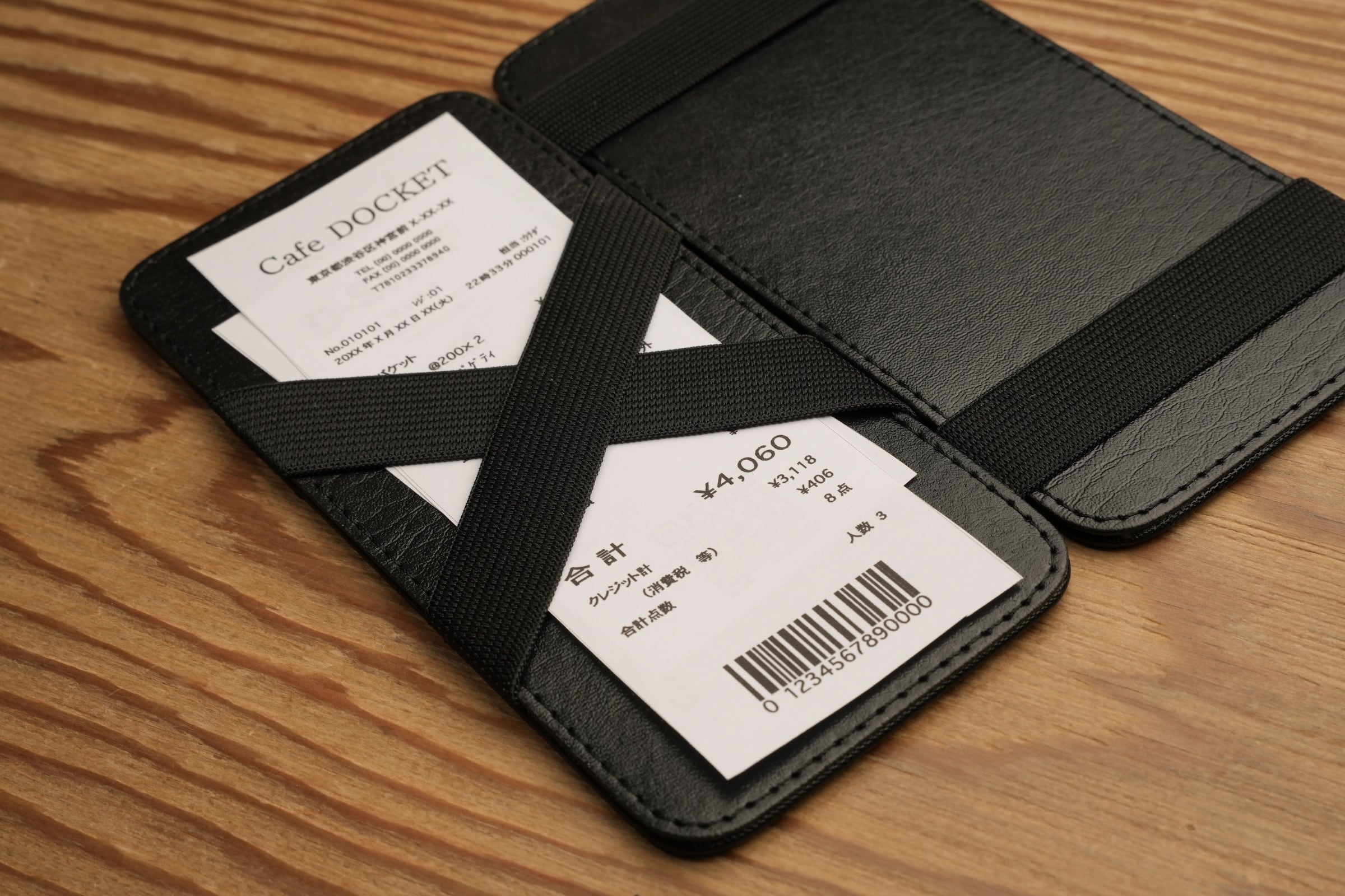 独特なゴムバンドの組み合わせで、紙幣を挟む財布の構造を転用したレシートホルダー。