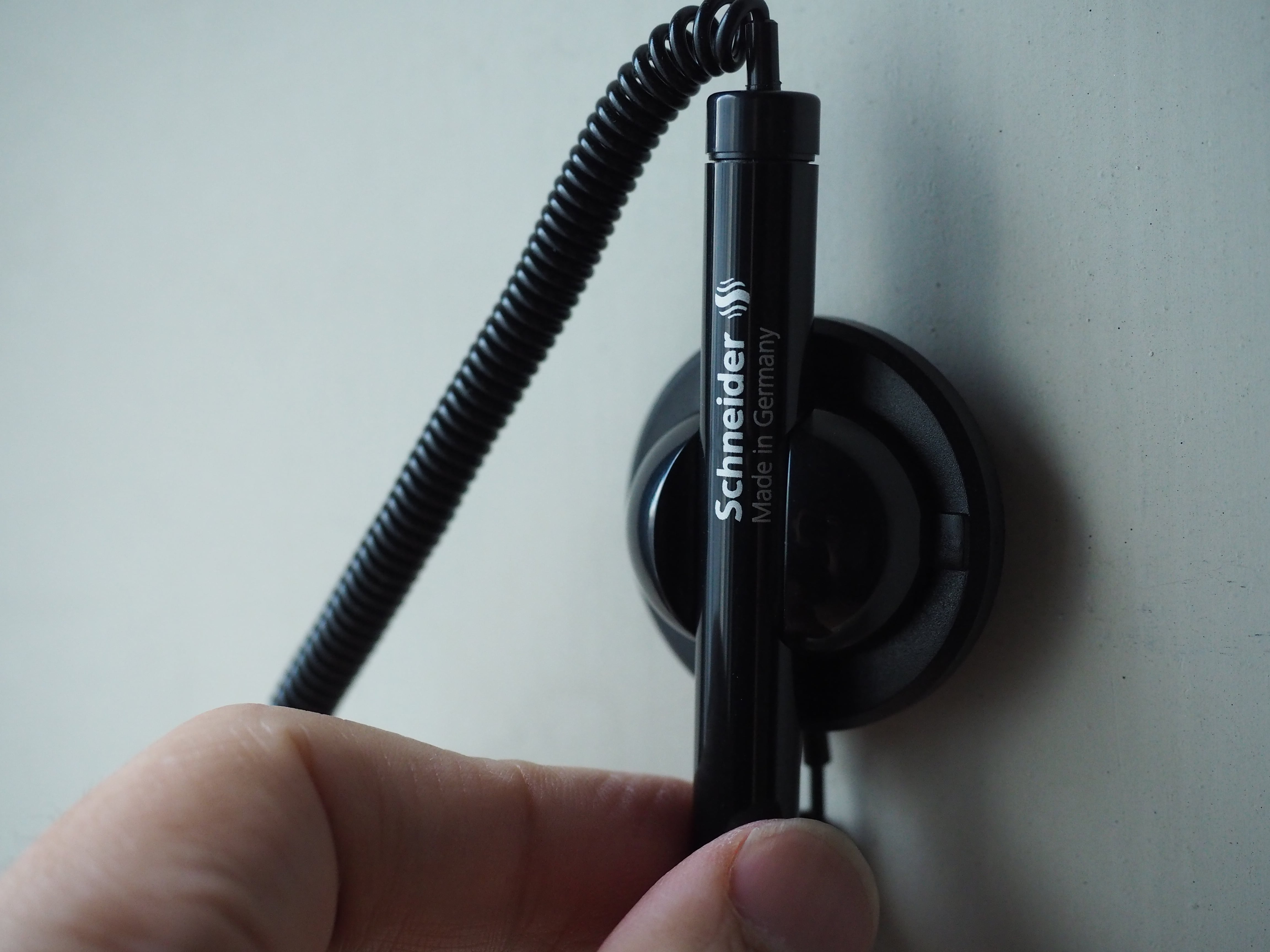 拡張可能なカールコードとペンホルダー付きのボールペン。