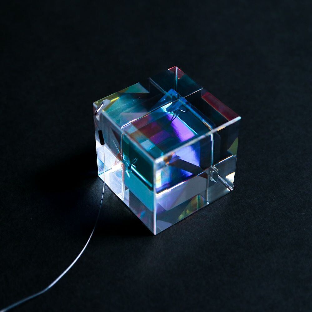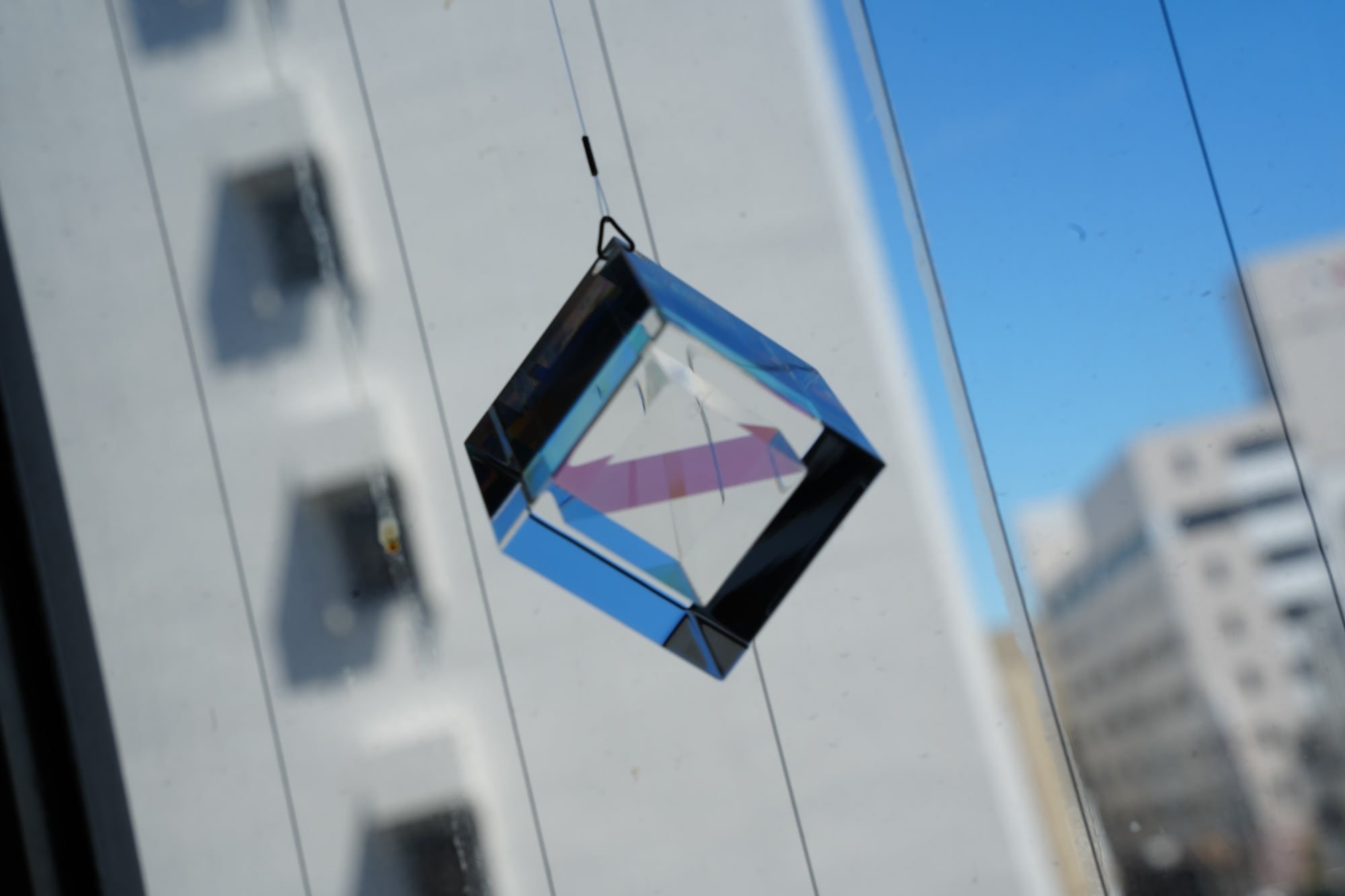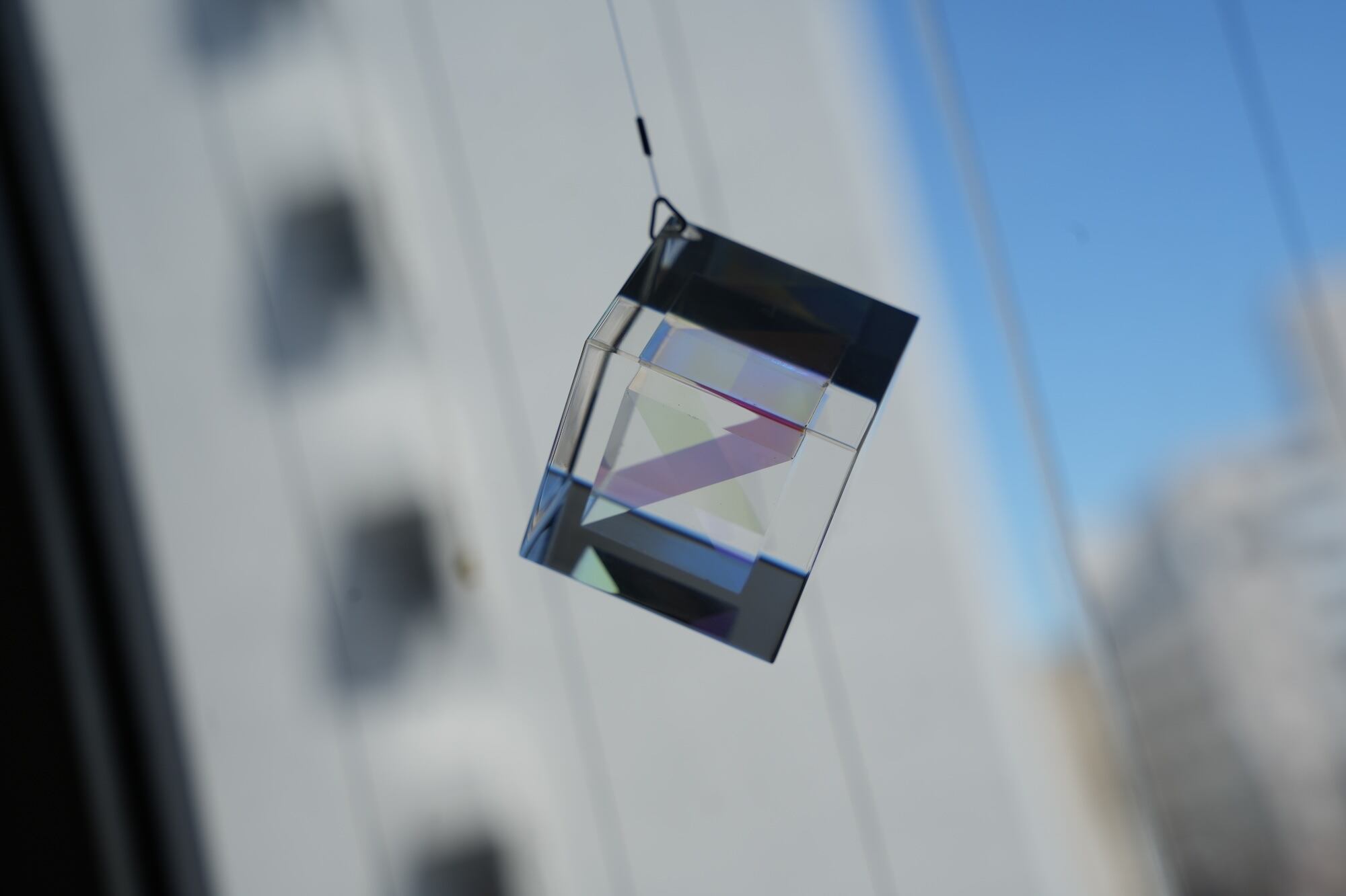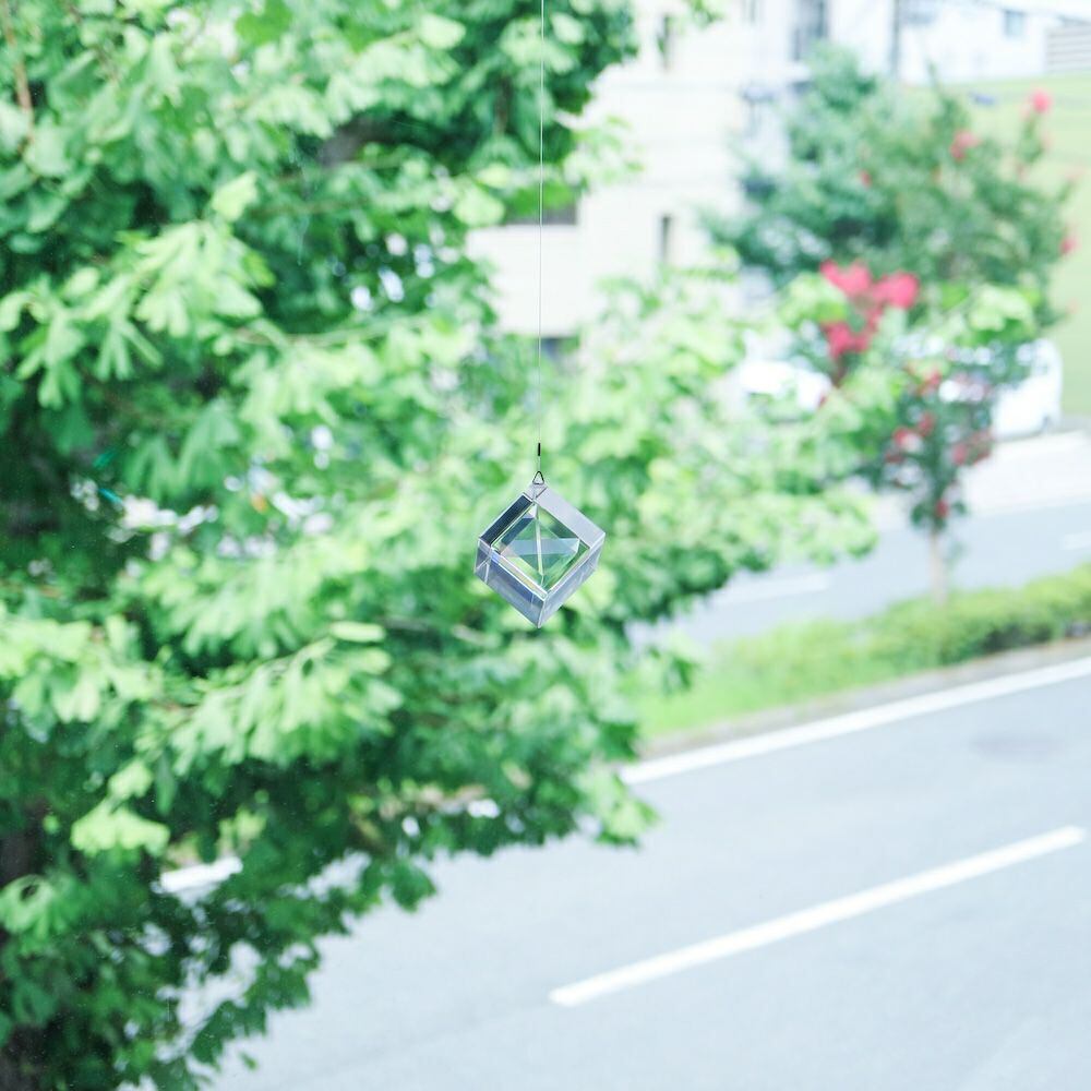 置いて飾る従来のプリズムとは異なり、吊るすことで揺れたり回転したりするため、動きのある光のグラフィックをお楽しみいただけます