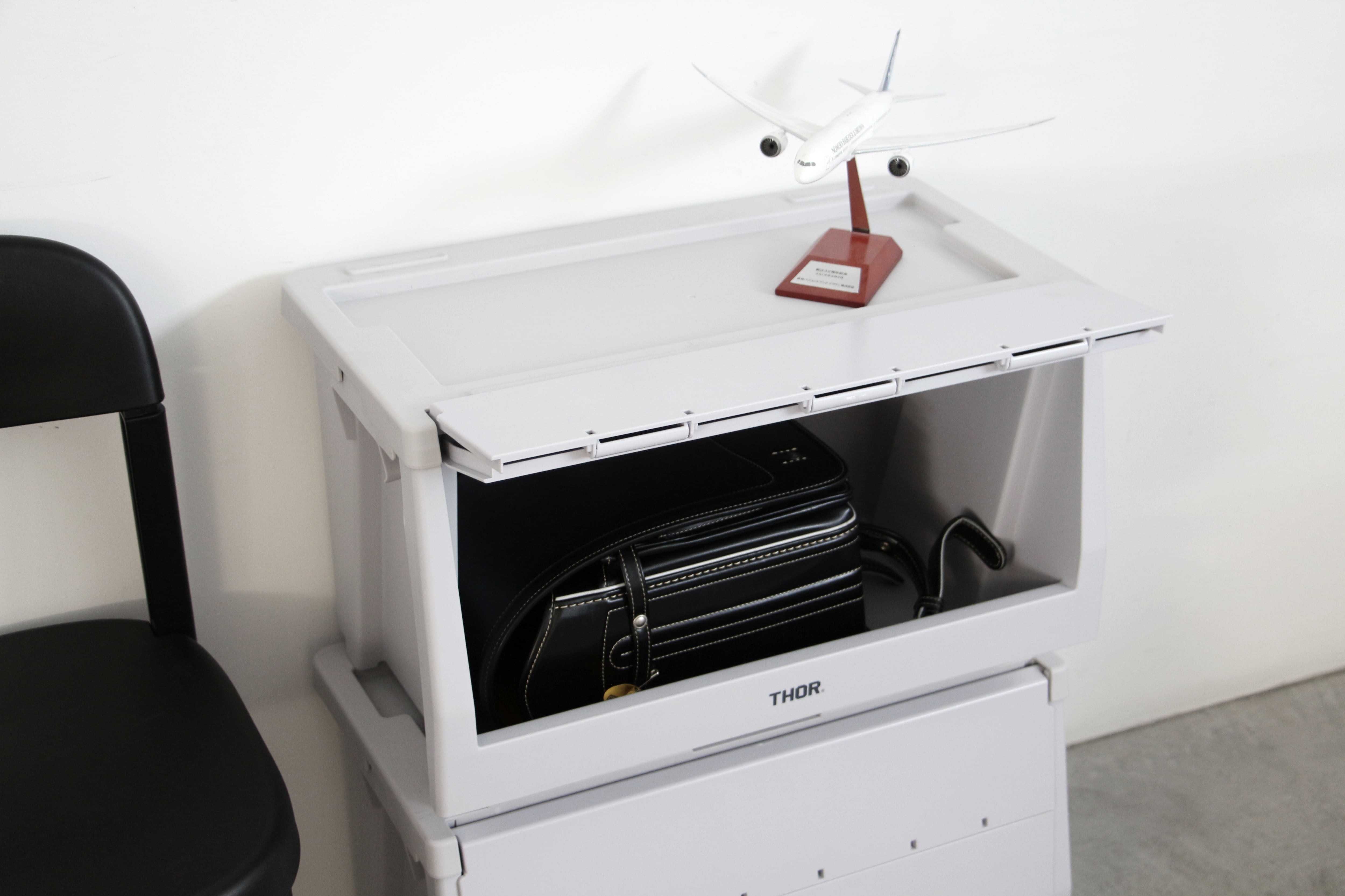 THOR STACKING SHELF CONTAINER単体でも、50Lスタッキングして使用することができるので、最上段だけ上蓋を取り付けていただければ、ホコリ等がかかるのを防ぎつつ、上に物を置くことができます。(上蓋をつけてスタッキングすることも可能です。)