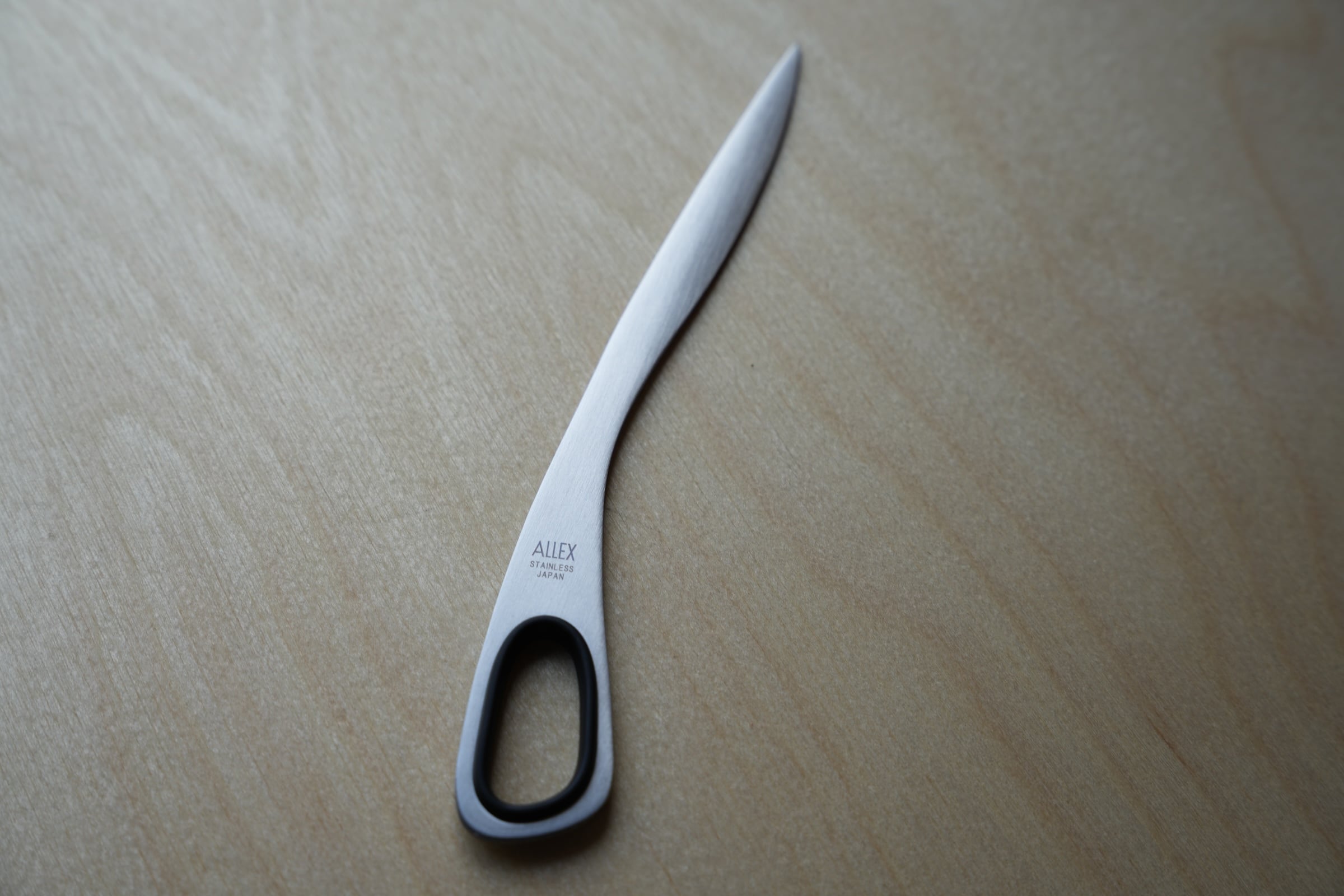 林刃物さんの事務用はさみと並べて使いたくなるペーパーナイフ 封筒の開封に役立ってくれます。 本体サイズ:170✕30x7mm 刃渡り:60mm 板厚:2.3mm 材質:本体/ステンレス刃物鋼、リング/エラストマー樹脂 重さ:26g 日本製