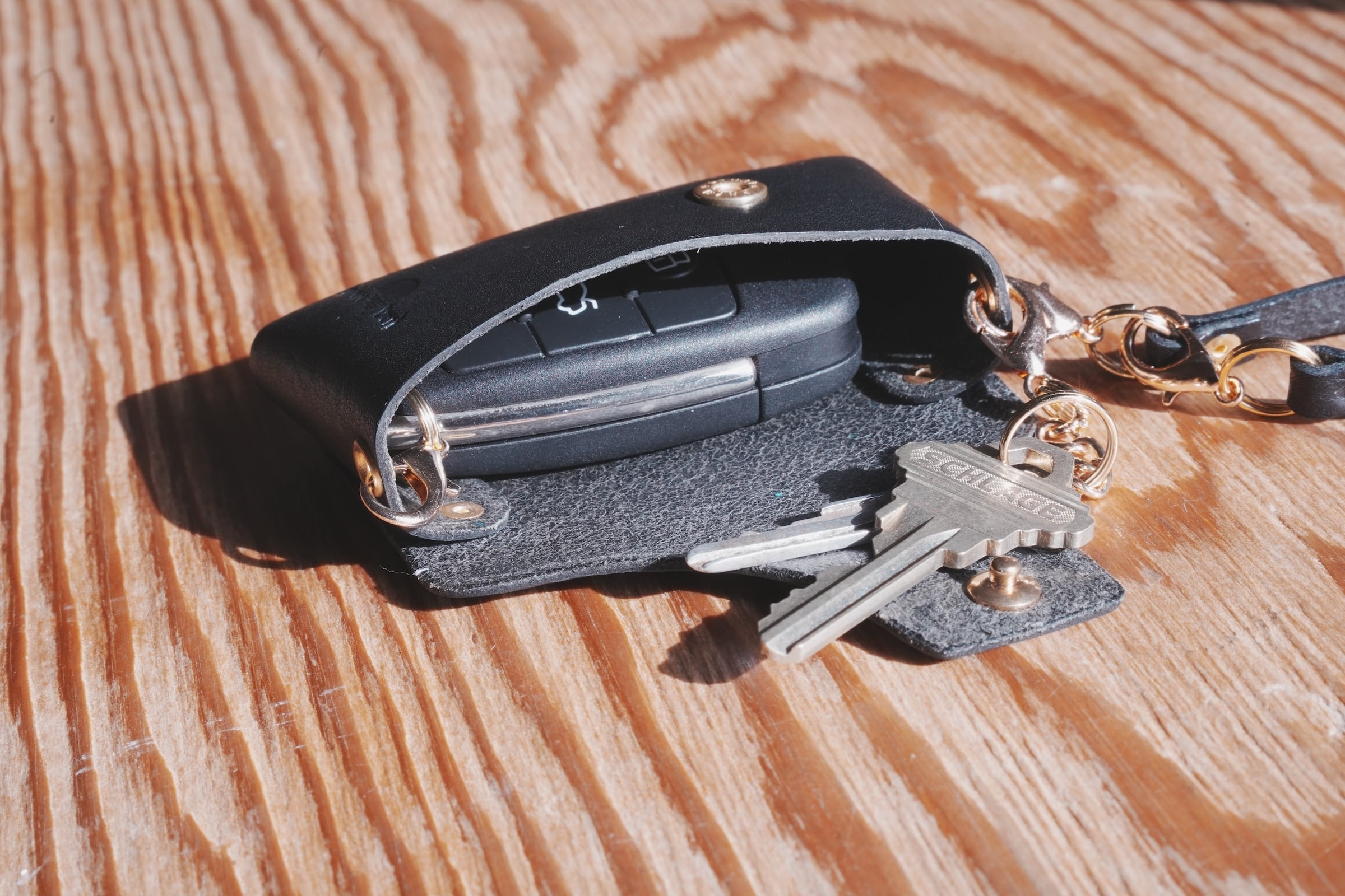 手のなじみも良いイタリアンレザーで仕上げられており、ストラップとカギの取り付けもチェーンの有り無しで長さを変えて、普通のカギとリモコンキーを分けて取り出しやすく設計されています